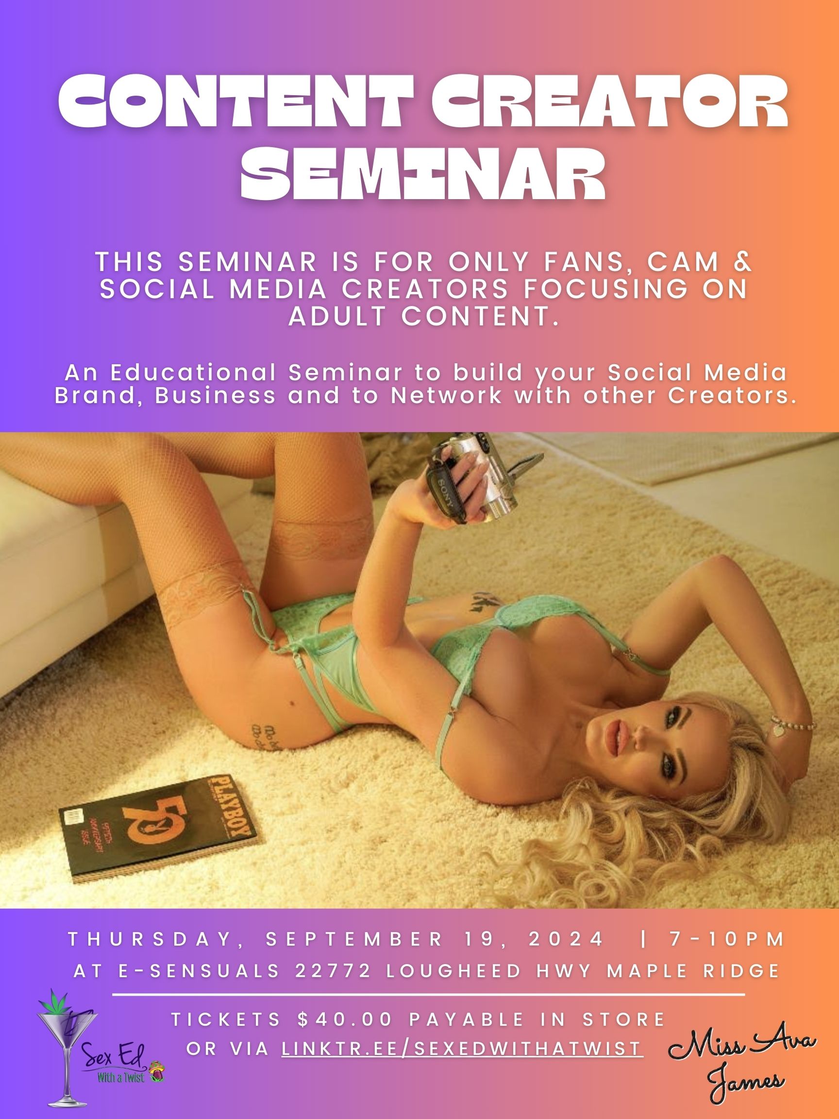After meeting Ava (online name) she received amazing positive support for her Online Business and that is what she does is promote herself and her body online and controls 100% of the content and the money. So what Ava and I wanted to to was offer a networking and a seminar to help women (which is our first seminar as we need to feel comfortable before offering this seminar to men or other identities for safety reasons). So our Seminar for Adult Content Creators was created.